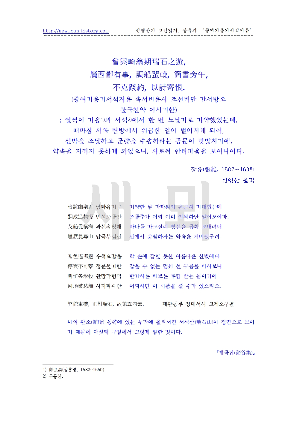 | 장유의 한시 '차운증기옹(次韻贈畸翁)' 원문과 풀이 (0) | 2025.11.29 |