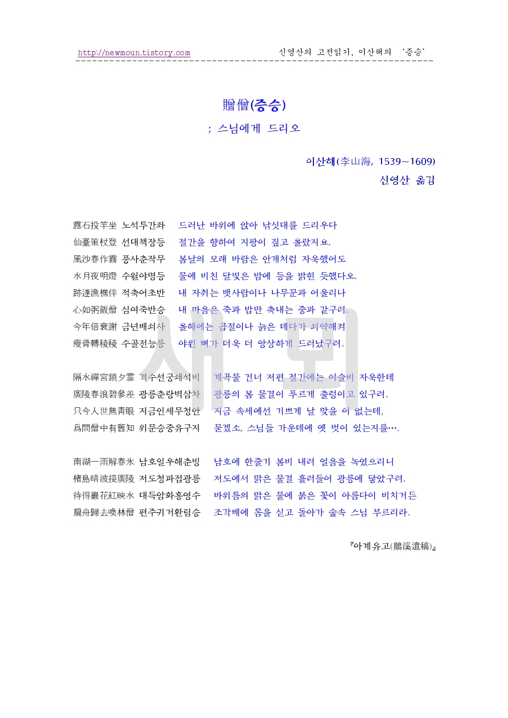 | 이산해의 한시 '송산인삼준귀오대산(送山人三俊歸五臺山)' 원문과 풀이 (0) | 2025.11.30 |