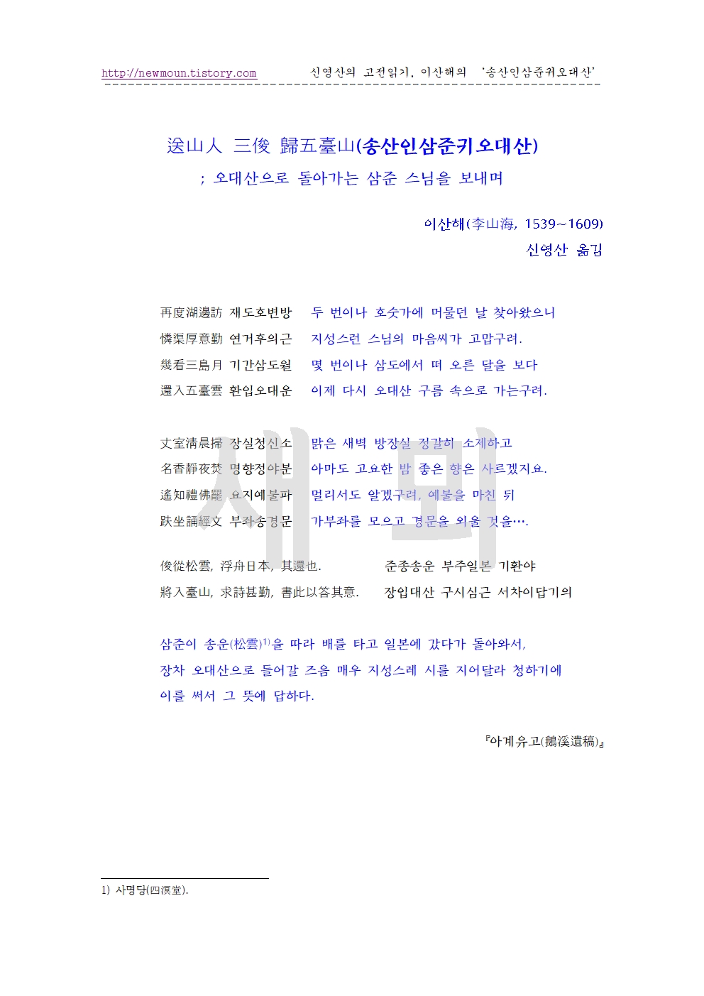 | 이산해의 한시 '송산인혜구환산(送山人惠球還山)' 원문과 풀이 (0) | 2025.11.30 |