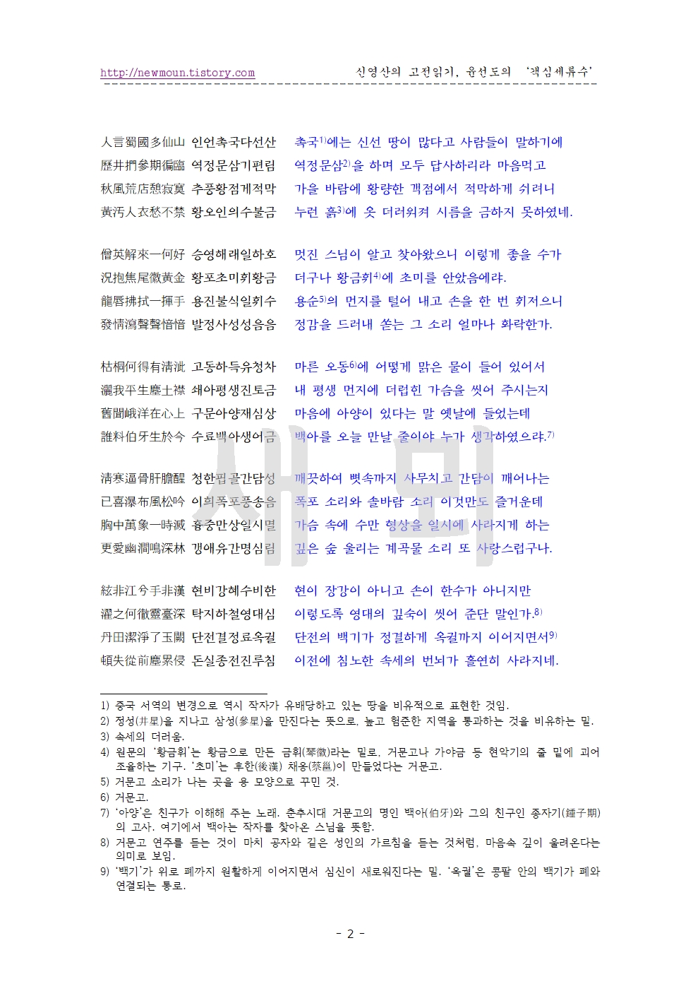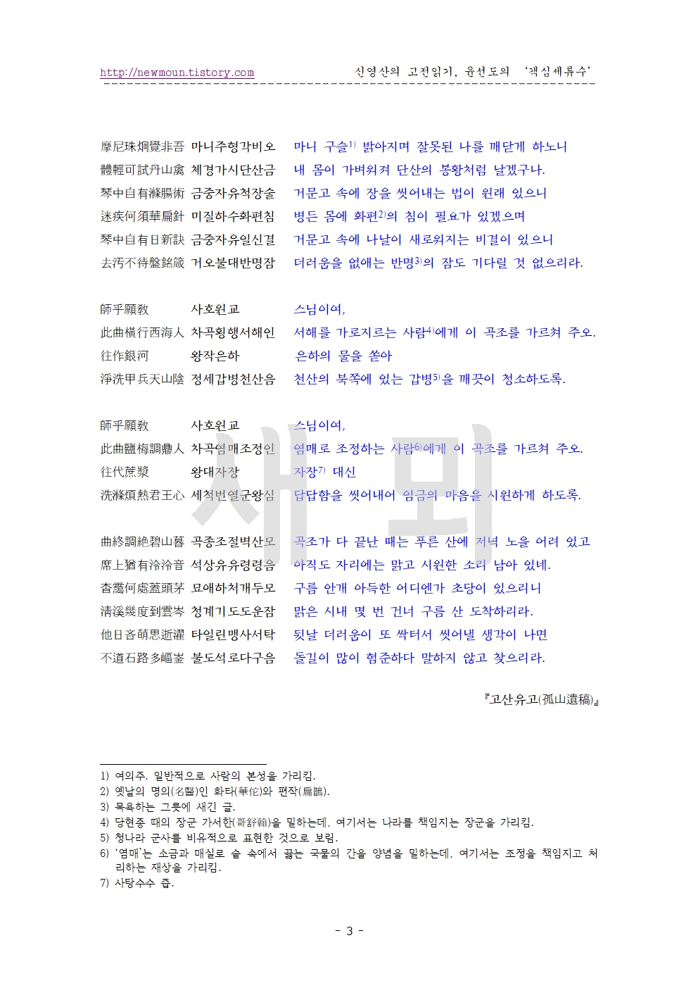 | 윤선도의 한시 '추야우음차고운(秋夜偶吟次古韻)' 원문과 풀이 (0) | 2025.12.11 |