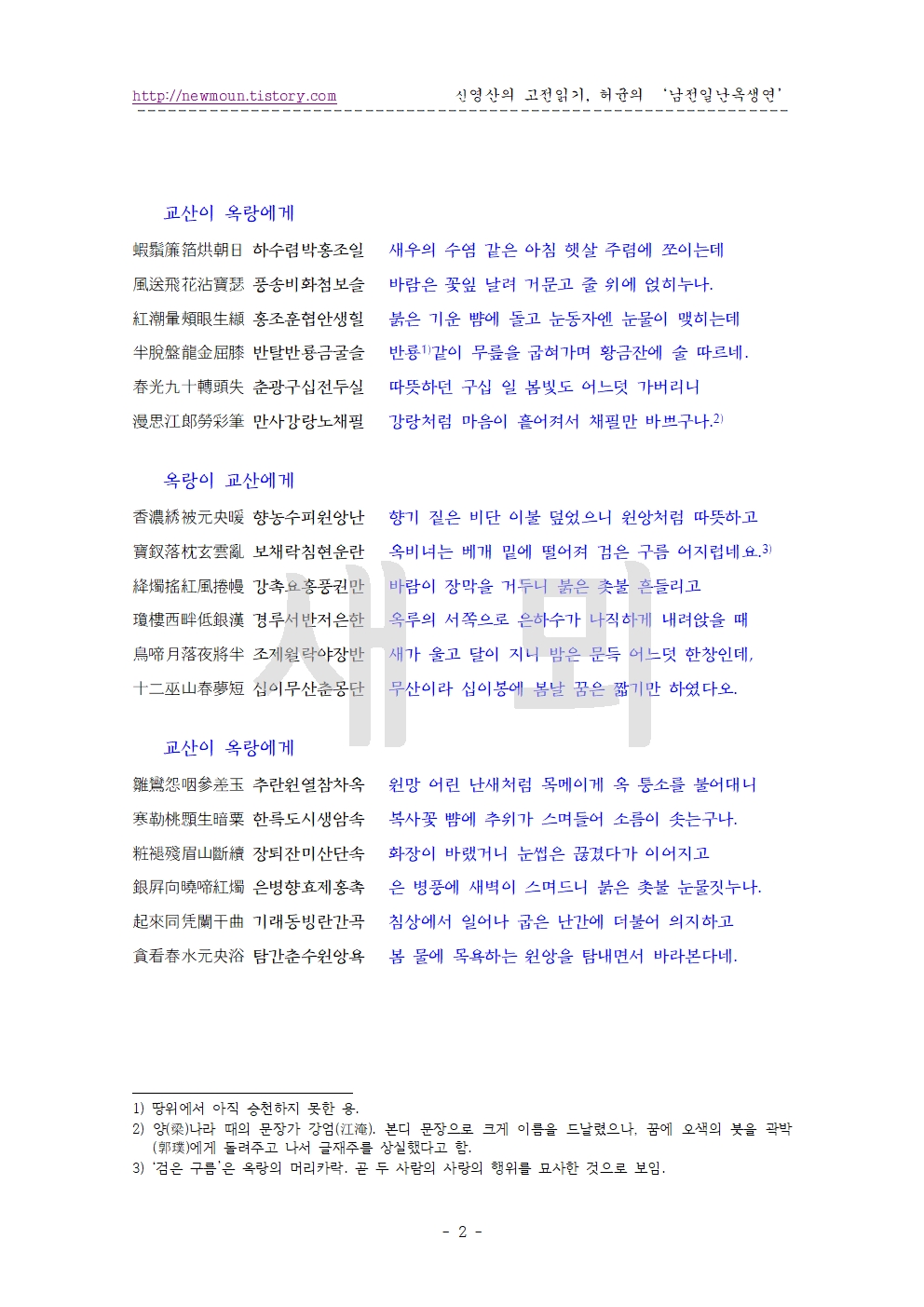 | 허균의 한시 '유증무산장옥랑(留贈巫山張玉娘)' 원문과 풀이 (0) | 2025.12.12 |