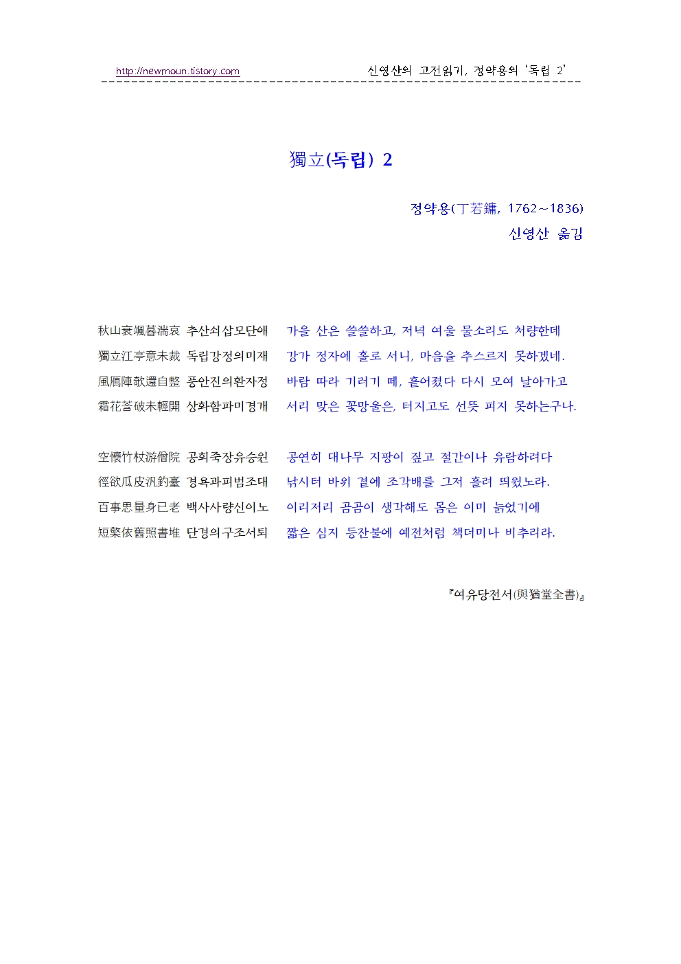 | 정약용의 한시 '독립(獨立)_1' 원문과 풀이 (0) | 2026.03.02 |