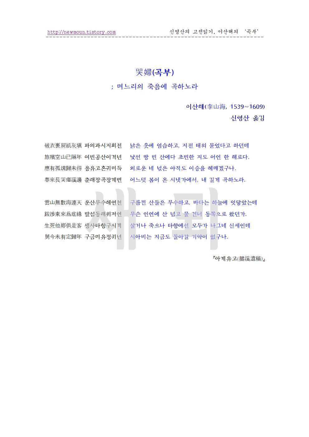 | 이산해의 한시 '곡녀(哭女)' 원문과 풀이 (0) | 2026.03.04 |