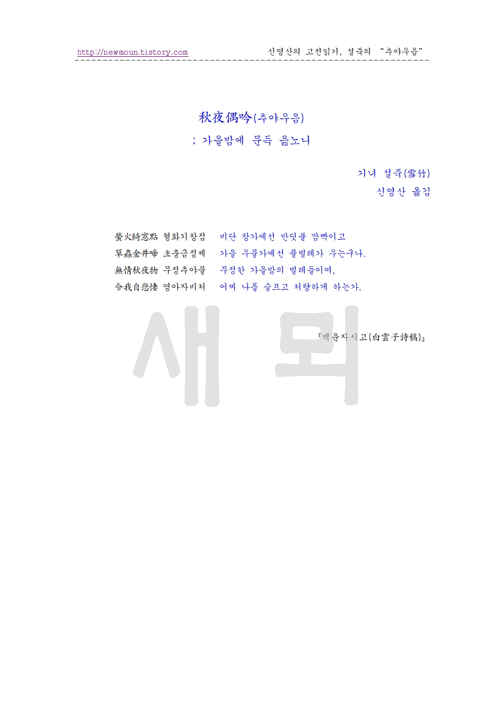 | 기녀 설죽의 한시 '추규(秋閨)' 원문과 풀이 (0) | 2025.08.03 |