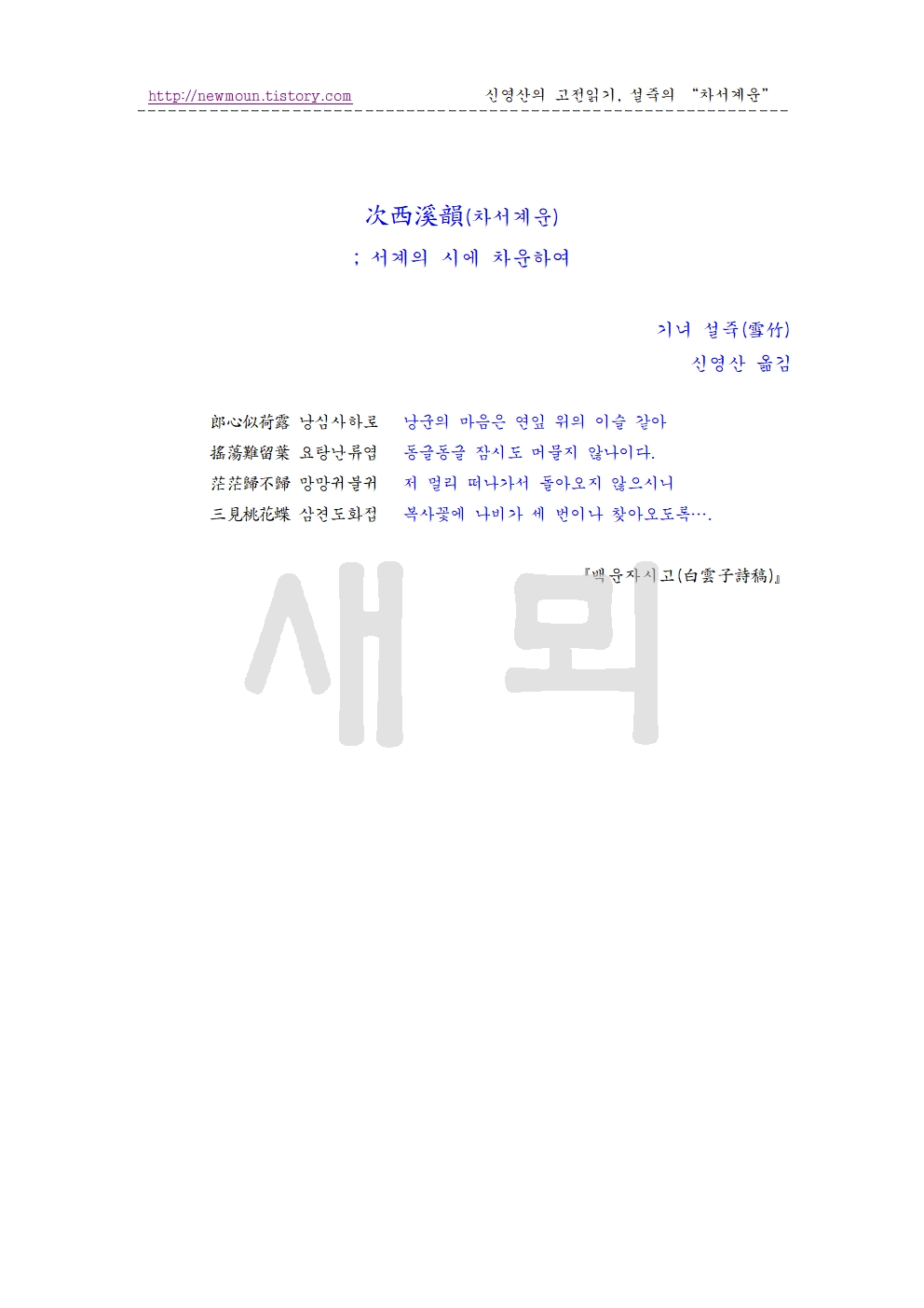 | 기녀 설죽의 한시 '차김배옹운(次金排翁韻)' 원문과 풀이 (0) | 2025.08.12 |
